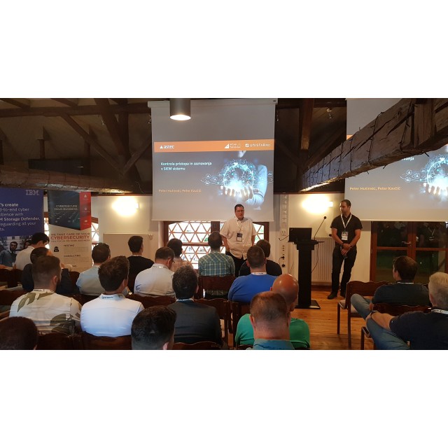 Med raznovrstnimi predavanji na dogodku, je bilo tudi naše predavanje, ki sta ga prezentirala sodelavca Peter Hutinski in Peter Kavčič. Tema predavanja je bila "Kontrola pristopa in zaznavanja v SIEM sistemu" in v sklopu tega sta razložila, kako lahko integracija teh sistemov izboljša varnost podjetja, omogoča natančno sledenje in odzivanje na grožnje v realnem času ter dvigne raven zaščite podatkov.
