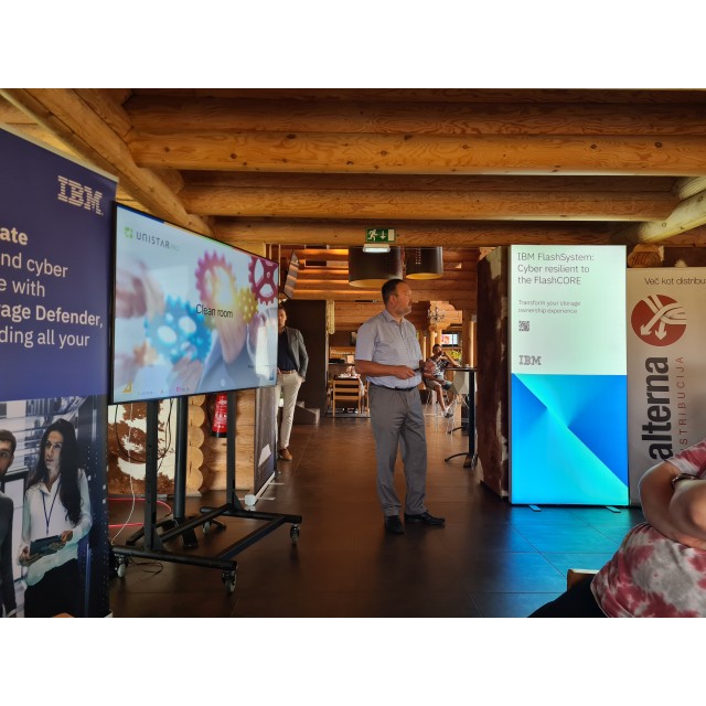 Na dogodku smo predstavili IBM FlashSystem, ki uporablja umetno inteligenco za zaščito kritičnih podatkov pred naraščajočimi kibernetskimi grožnjami in IBM Storage Defender, celovit programski paket za odpornost podatkov. Predstavitev je obsegala trende in posledice napadov z izseljevalsko programsko opremo, predavanje je vodil Dejan Podgoršek, IBM, o varnosti in dostopnosti podatkov ter kako lahko pospešimo svoje okolje RHOS z IBM Fusion pa je predstavil David Kosmač iz IBM. Udeleženci so imeli priložnost spoznati, kako lahko svoje podatke varno shranijo v našem PRO.Cloud okolju s strani našega sistemskega inženirja Primoža Berganta. Poleg tega smo obravnavali tudi zelo aktualno temo "Kako se pripraviti na NIS-2," kjer sta svoja strokovna znanja delila Alen Jamšek in Peter Hutinski.